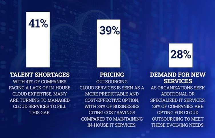 • Talent shortages – With 41% of companies facing a lack of in-house cloud expertise, many are turning to managed cloud services to fill this gap.